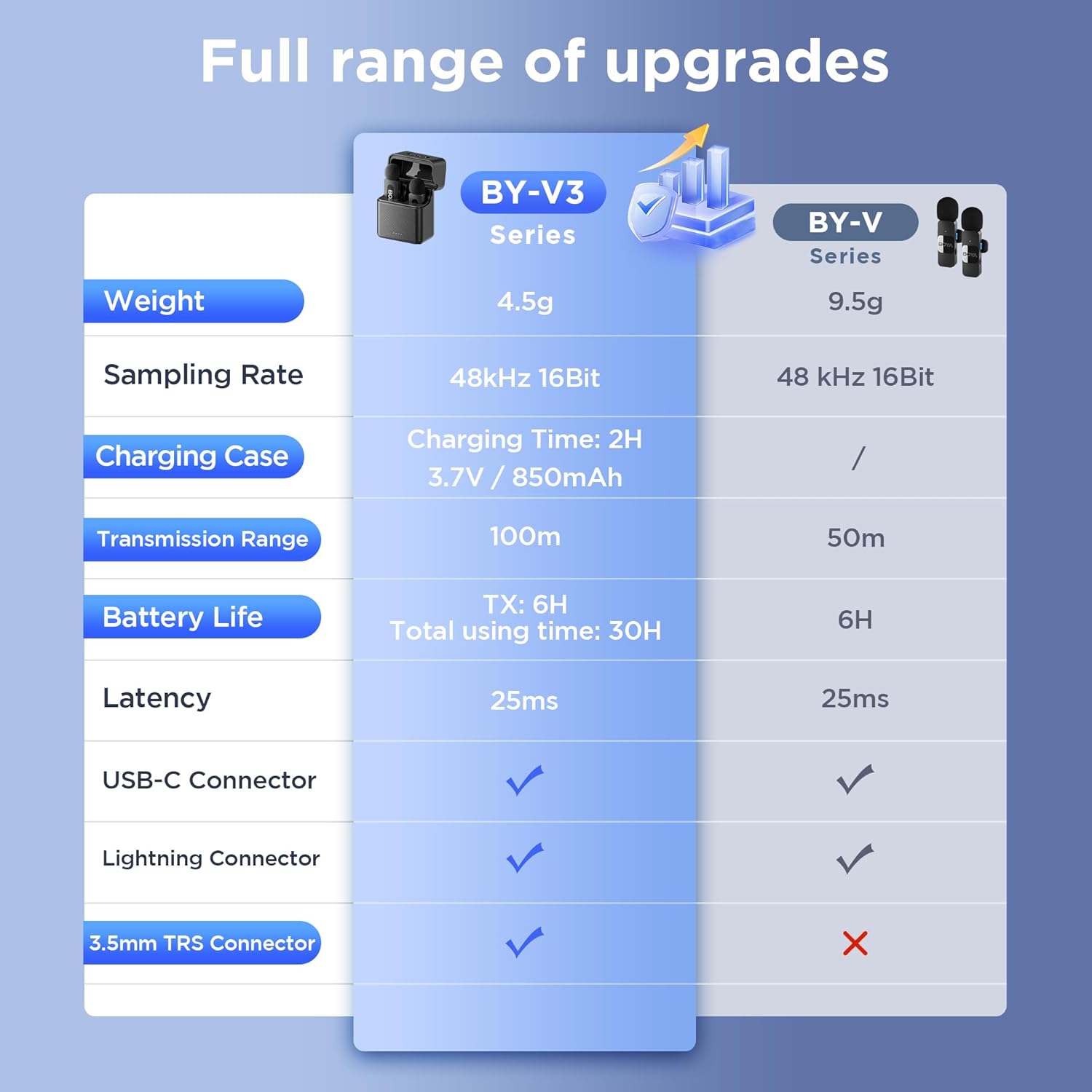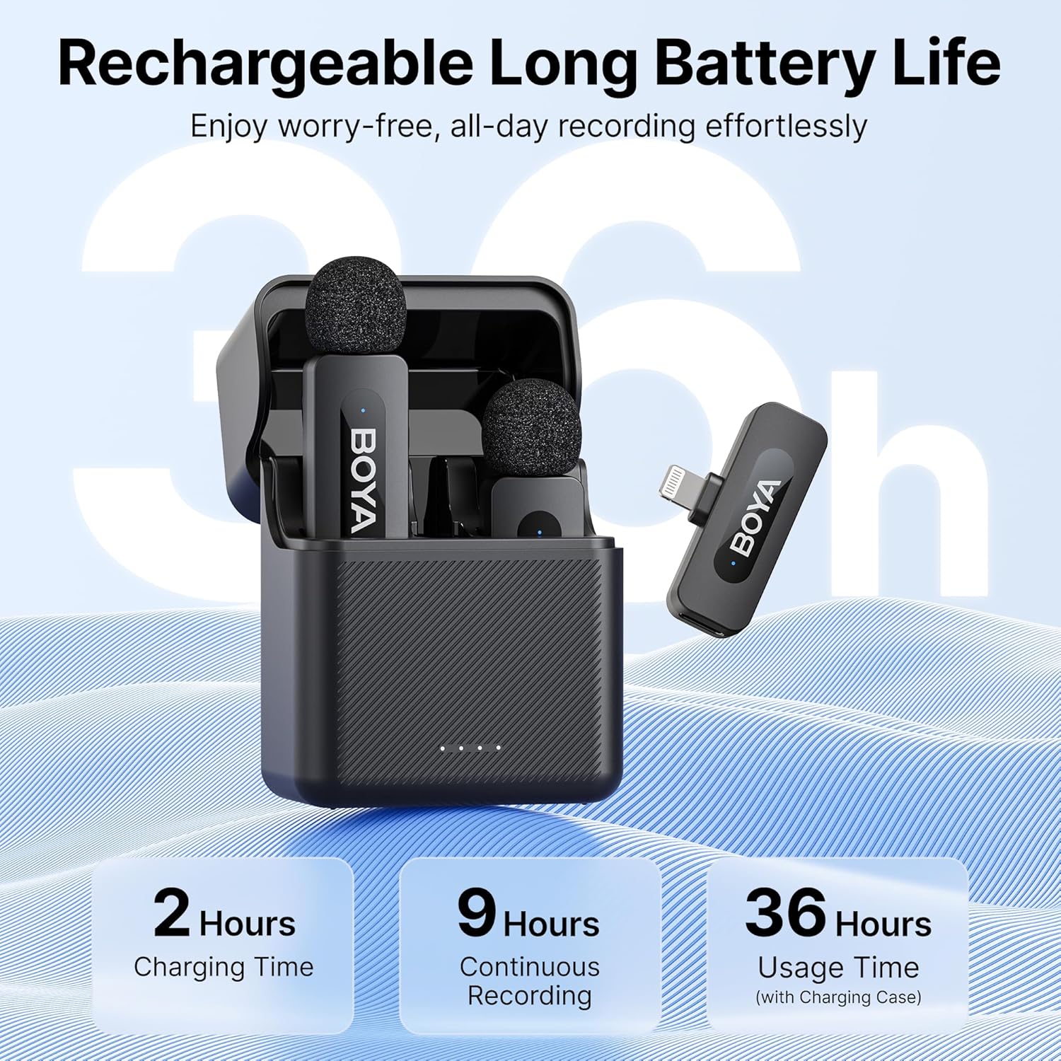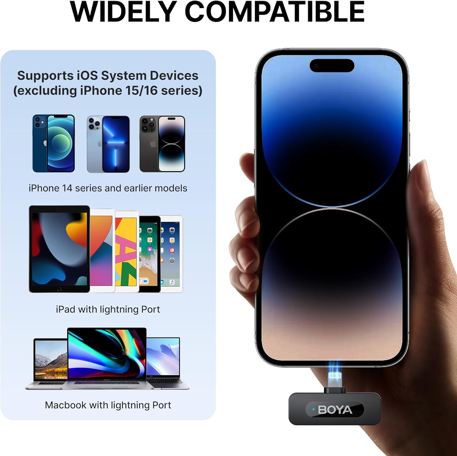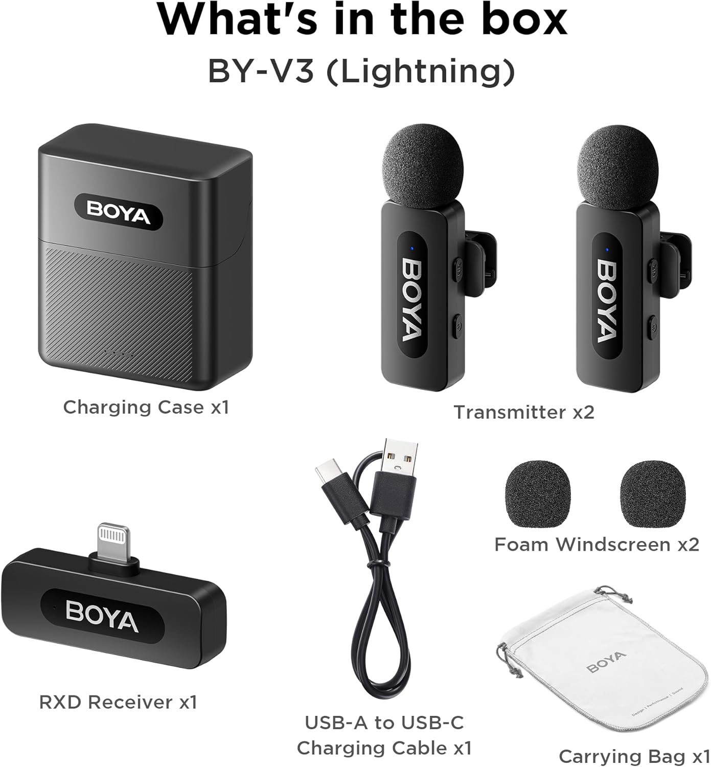 - Lightning Wireless Lavalier Microphone with Charging Case — BOYA BY-V3 comes with a Lightning receiver, 2 transmitters, charging case, carrying case. Please note: This microphone is not compatible with the iphone 15/16 series.