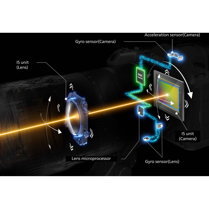 A lightweight, compact build encourages users to hand-wield the camera, and here as elsewhere the R5 Mark II’s new innards yield performance gains. Coordinated control helps achieve the optimum hand-shake correction effects, benefitting handheld shooting in low-light conditions and reducing shake when recording videos. The five-axis in-body image stabilizer (IBIS) corrects up to 8.5 stops of unwanted camera shake in the center of the frame and 7.5 at the edges when used in conjunction with compatible Canon IS lenses. Additionally, Movie Digital IS uses the optical and sensor-shift stabilization methods along with digital IS to help acquire steadier footage while moving.