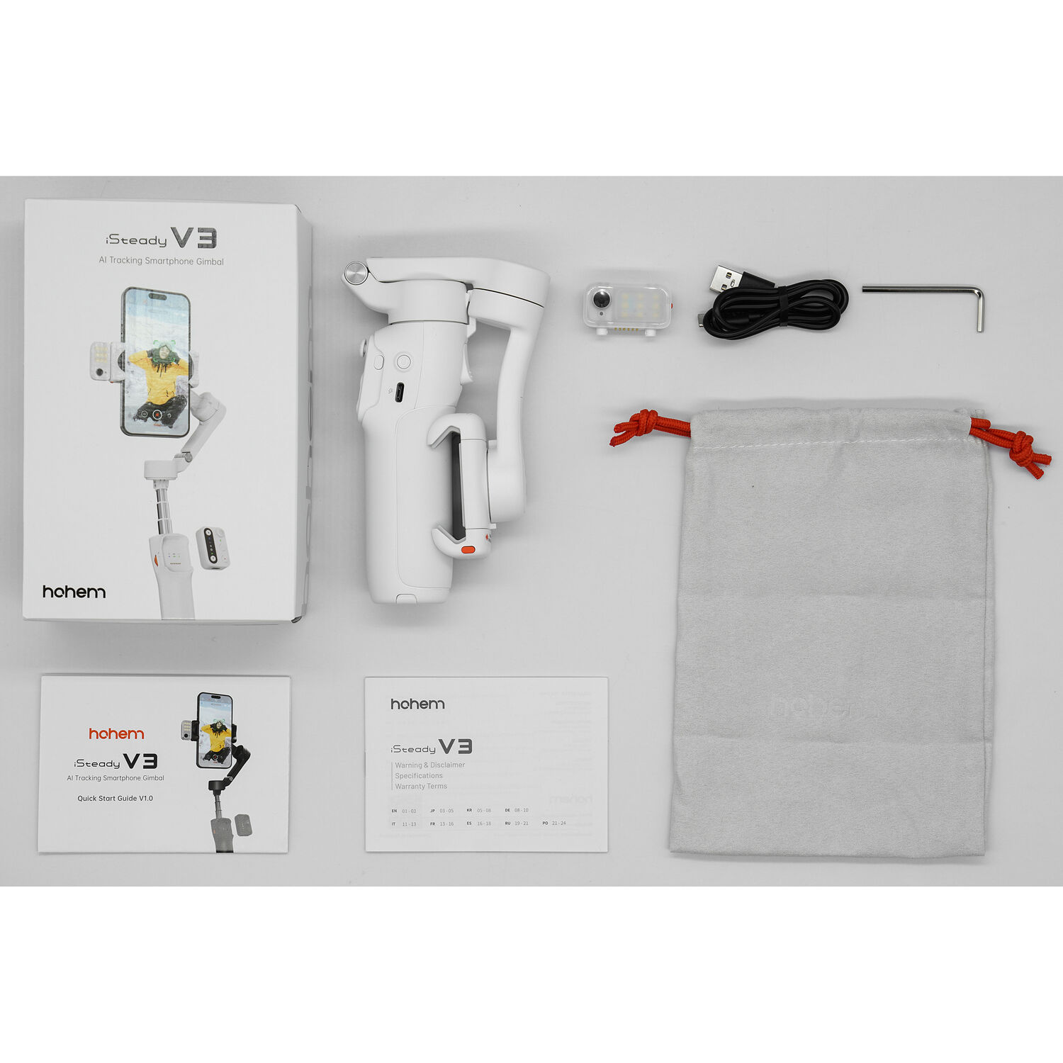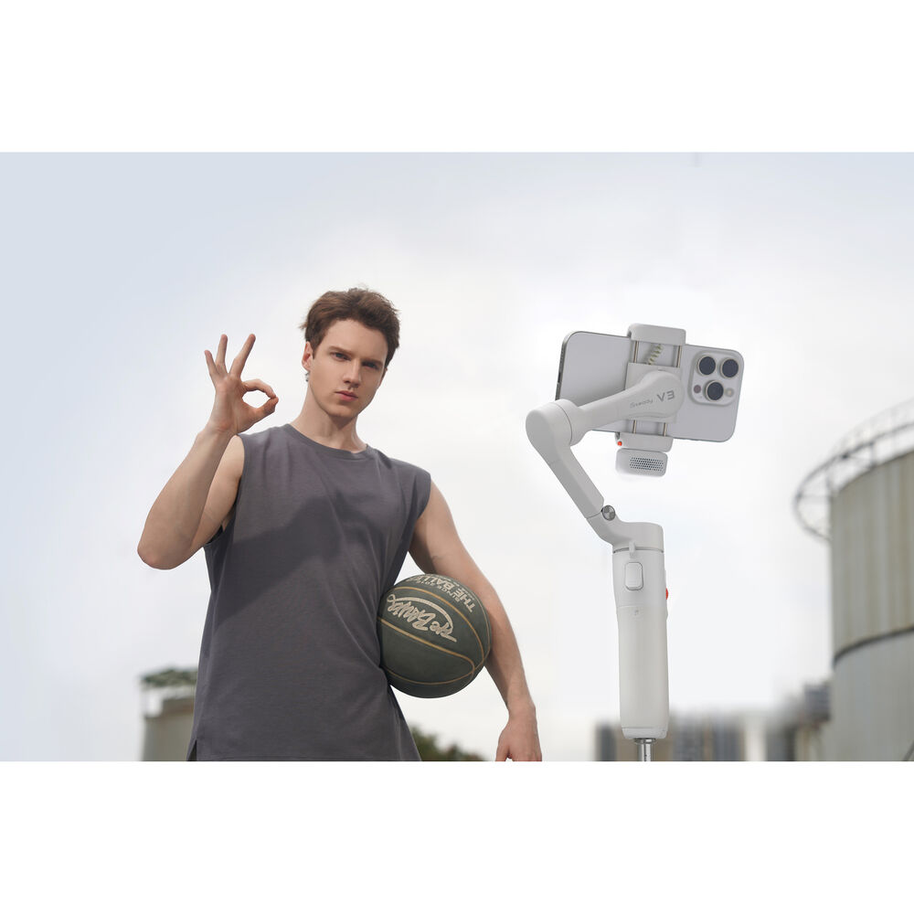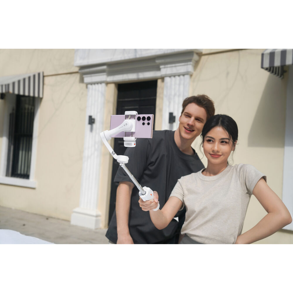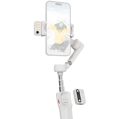 This white iSteady V3 AI Smartphone Gimbal from Hohem gives you the functionality of a selfie stick, a gimbal, and a tripod in one compact, foldable device. The upgraded V3 version of the gimbal features both a built-in tripod and an 8.1″ extension rod, as well as an included magnetic AI tracker with an LED light module for intuitive control. A load capacity of 10.6 oz and a clamping range of 2.3 to 3.9″ make the gimbal compatible with most smartphone models.