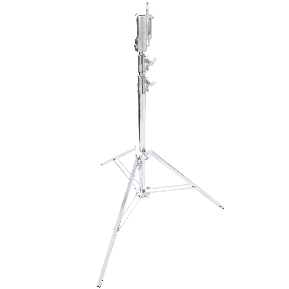 The master cine stand has solid steel construction and a maximum load capacity of 88.2 lbs (40 kg). It also features the triple function universal combo head withboth 1/8″ (28mm) and 5/8″ (16mm) receiver s plus a multi-direction 5/8″ (16mm) stud to accept any kind of mounting challenge. It is equipped witha leveling leg to extend one leg more than the others to level out the stand on an incline or uneven terrain. Maximum height is 10.7′ (3.25m) high above the ground.
