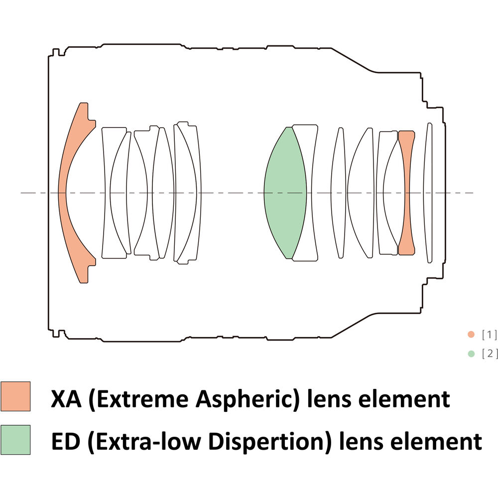 - Two XA (extreme aspherical) elements effectively control astigmatism, field curvature, coma, distortion, and other spherical aberrations for a high degree of sharpness and accurate rendering.