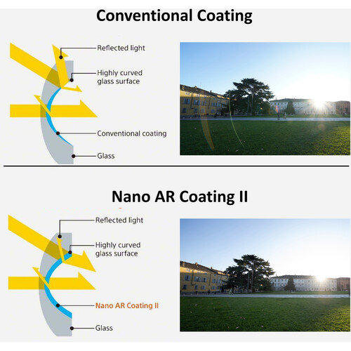 - Nano AR Coating II has been applied to reduce surface reflections, flare, and ghosting for increased contrast and color rendering in strong lighting conditions. This updated coating is better suited for larger, curved elements and is especially adept at minimizing internal reflections.
