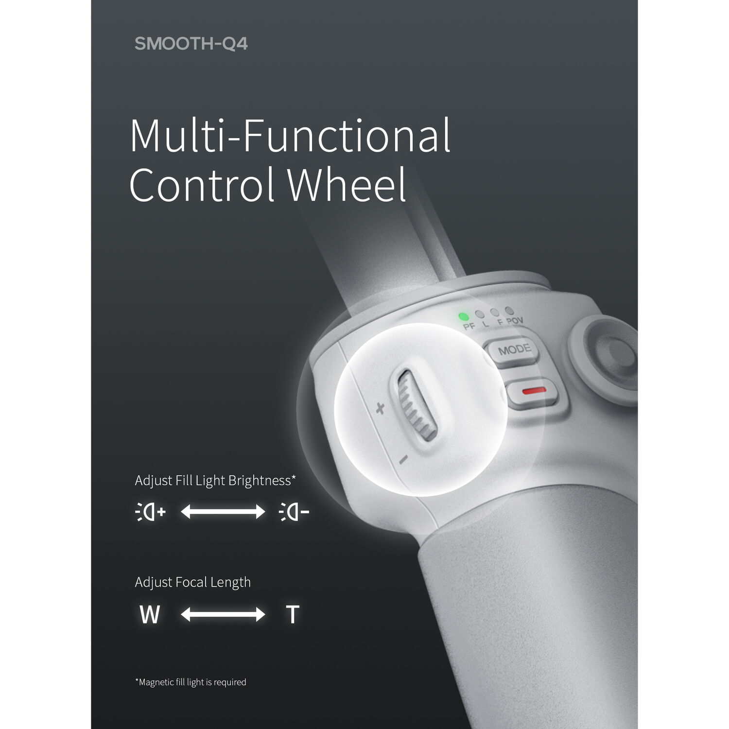 - Press the multi-functional control wheel to adjust the brightness of the separately available fill light. Slide to adjust your phone’s focal length.
