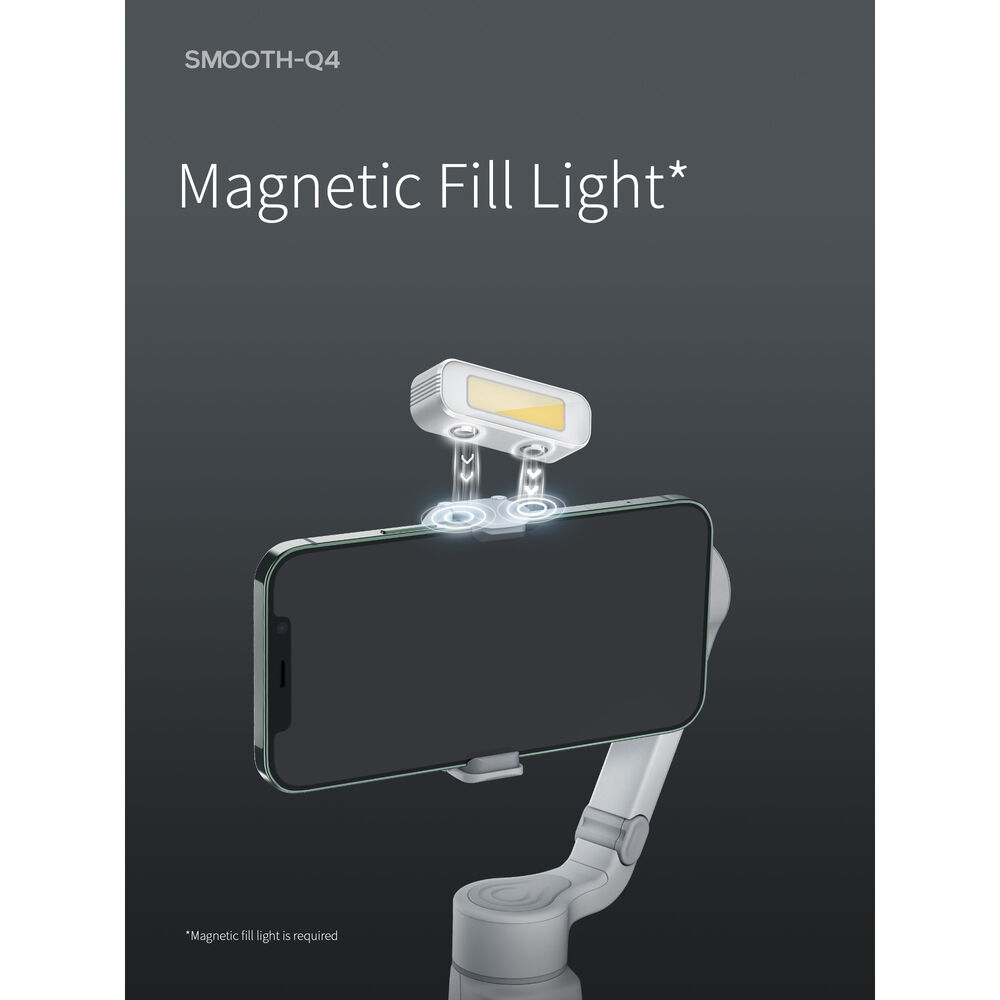 Operate the Smooth-Q4 with just one hand, thanks to the improved onboard controls and comfortable handgrip. Joysticks, buttons, and wheels control functions like gimbal mode and video recording. Various indicator lights on the gimbal display the current mode or power level. Extend the gimbal’s reach with the built-in 8.5″ extension rod. A mini tripod can be attached to the bottom of the Smooth-Q4 for stabilized, hands-free setups. Secure a separately available magnetic fill light to the gimbal for dim environments.
